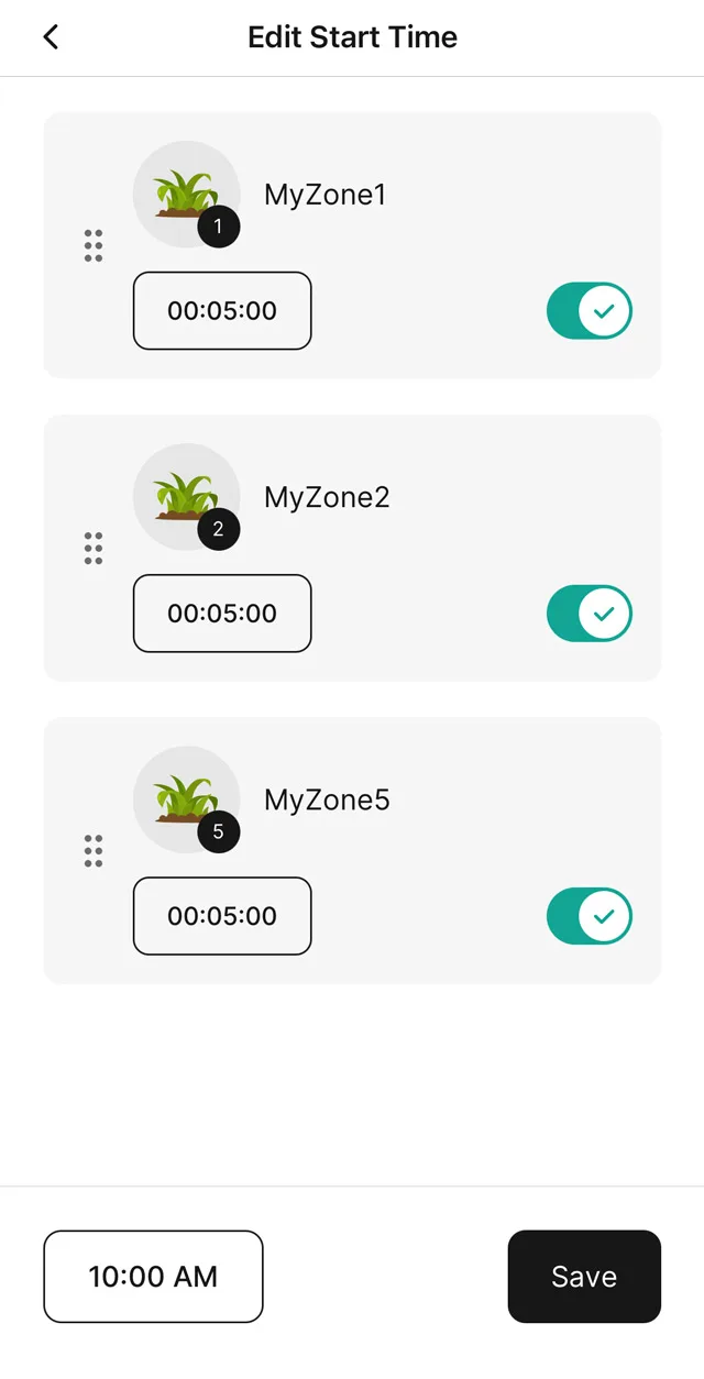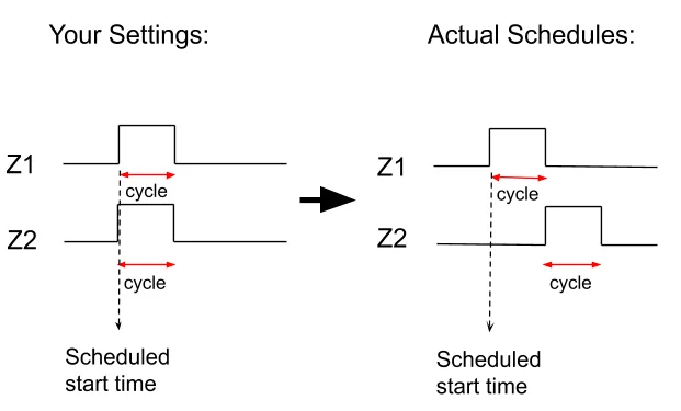 Only one zone can be active at the same time. If there are multiple programs with the same start time, we will rearrange the watering tasks to run in order. Multiple start times are allowed within the same program, and different watering durations are permitted for different start times, providing greater flexibility. For example, if you have zone #1 and zone #2 in a Manual Program with a specified start time and duration, the Manual Program will re-arrange so that the actual watering tasks will not overlap: