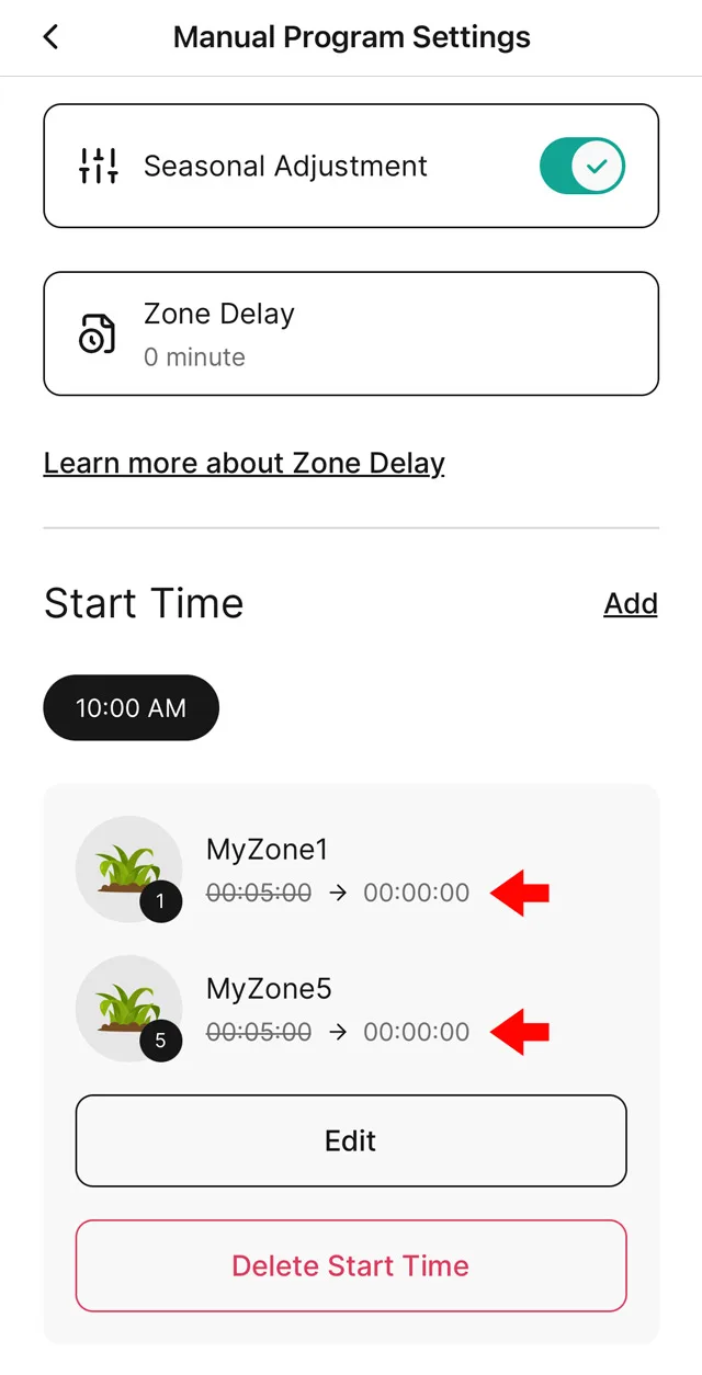 When you enable the “Seasonal Adjustment” feature, the “Duration” for the hottest month of a year is shown but the Actual Duration for the current month will be adjusted based on your Seasonal Adjustment Setting.