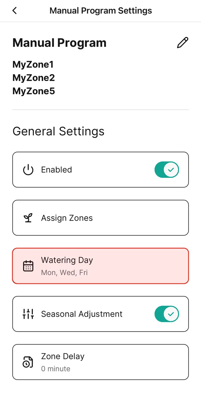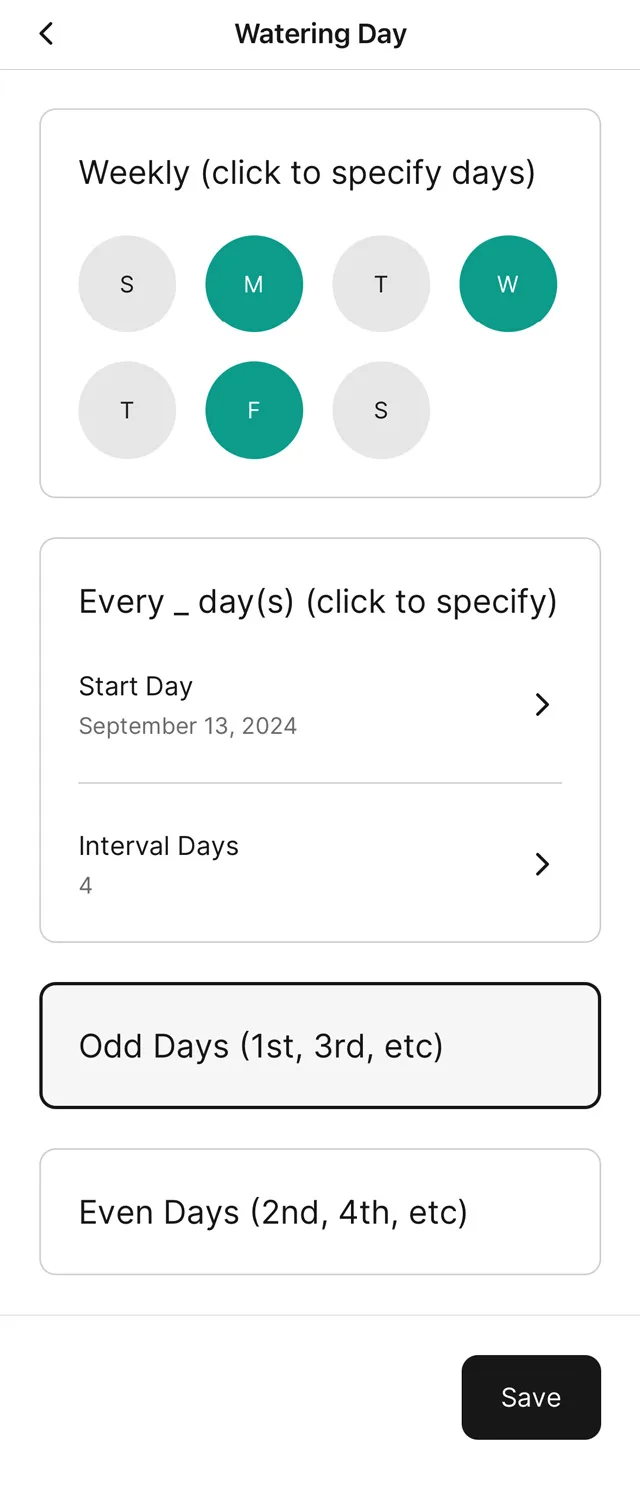 In the “Schedule” page, you need to specify the Watering Day with any of the 4 criteria: