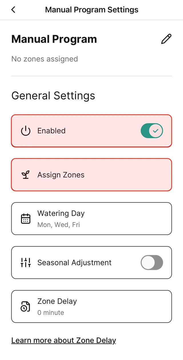 Please note that you need to assign at least one zone to a Manual Program in order to “Enable” it.