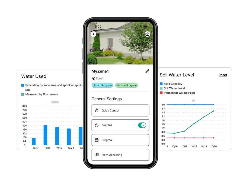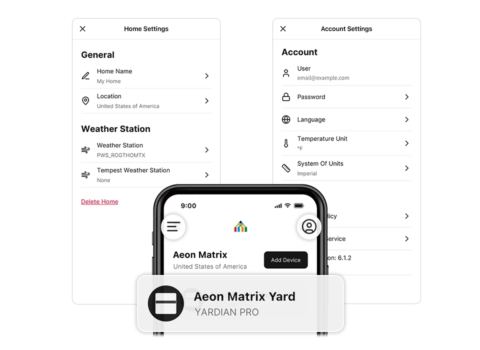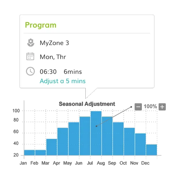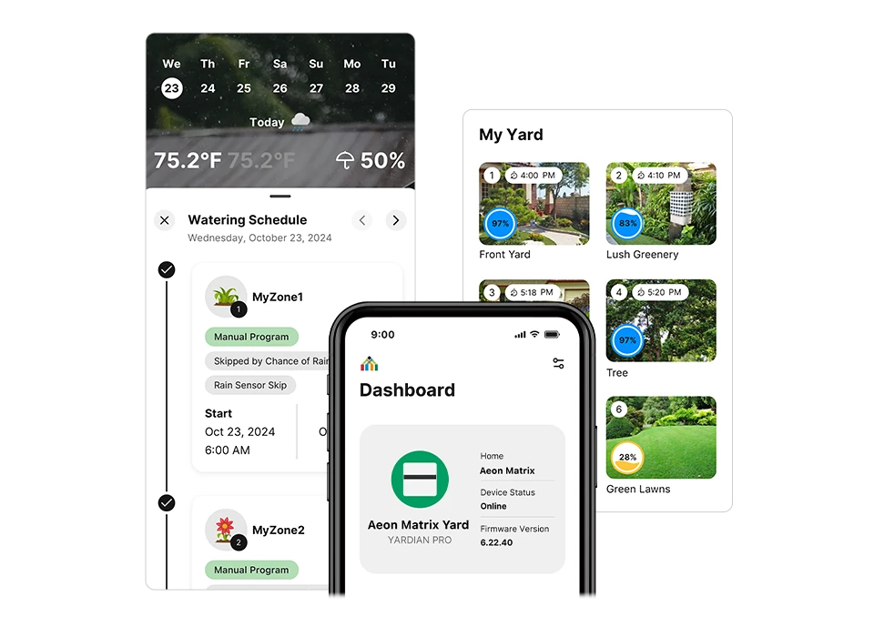 In the Main tab, you’ll be able to access your Yardian device settings and review the latest information regarding your watering schedule, zone settings, total water used, news, ect. Yardian receives and updates your 7-day watering schedules every day to guarantee uninterrupted service when it is temporarily offline.