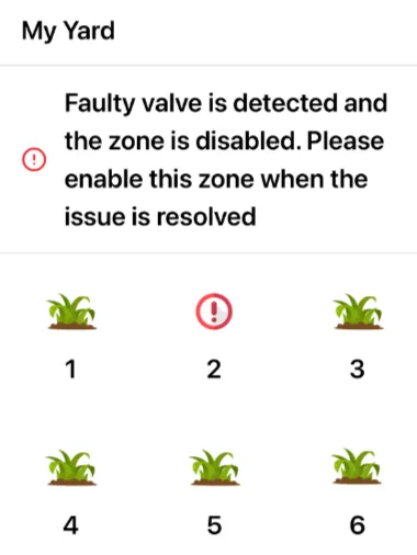 Note: A faulty solenoid valves will be marked in the app. Please check the solenoid coil on the valve. Please enable that zone in the app to clear the faulty valve message.