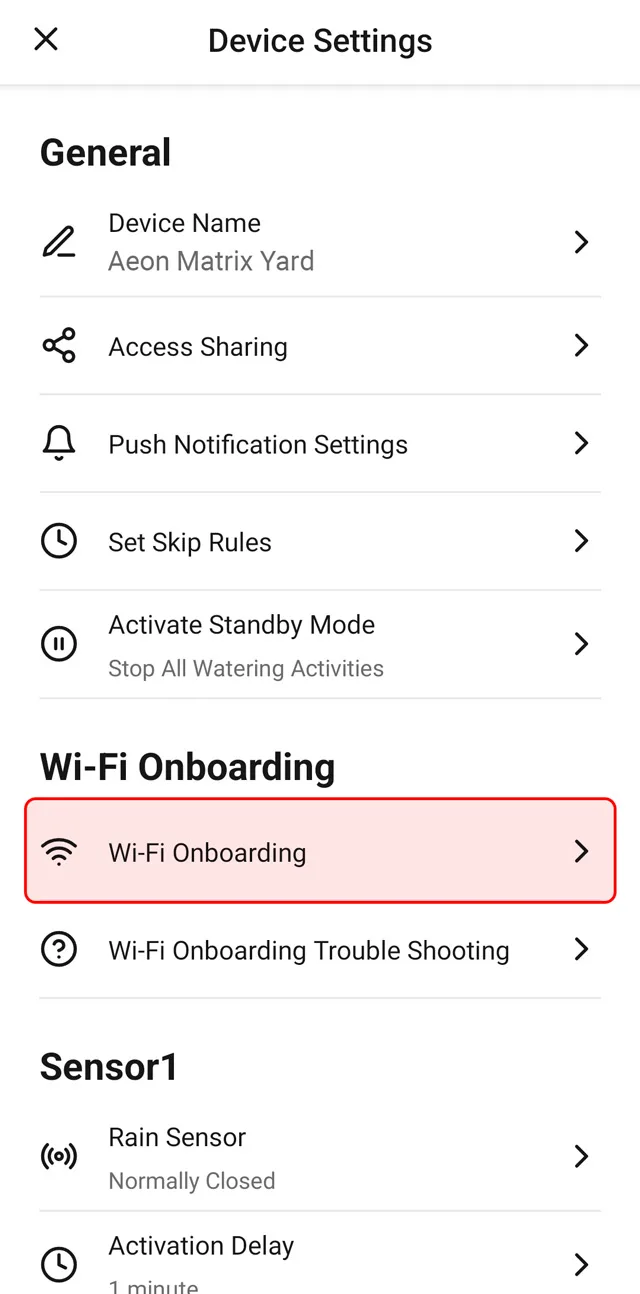 Click the Yardian Device Settings and go to “Wi-Fi Onboarding”.