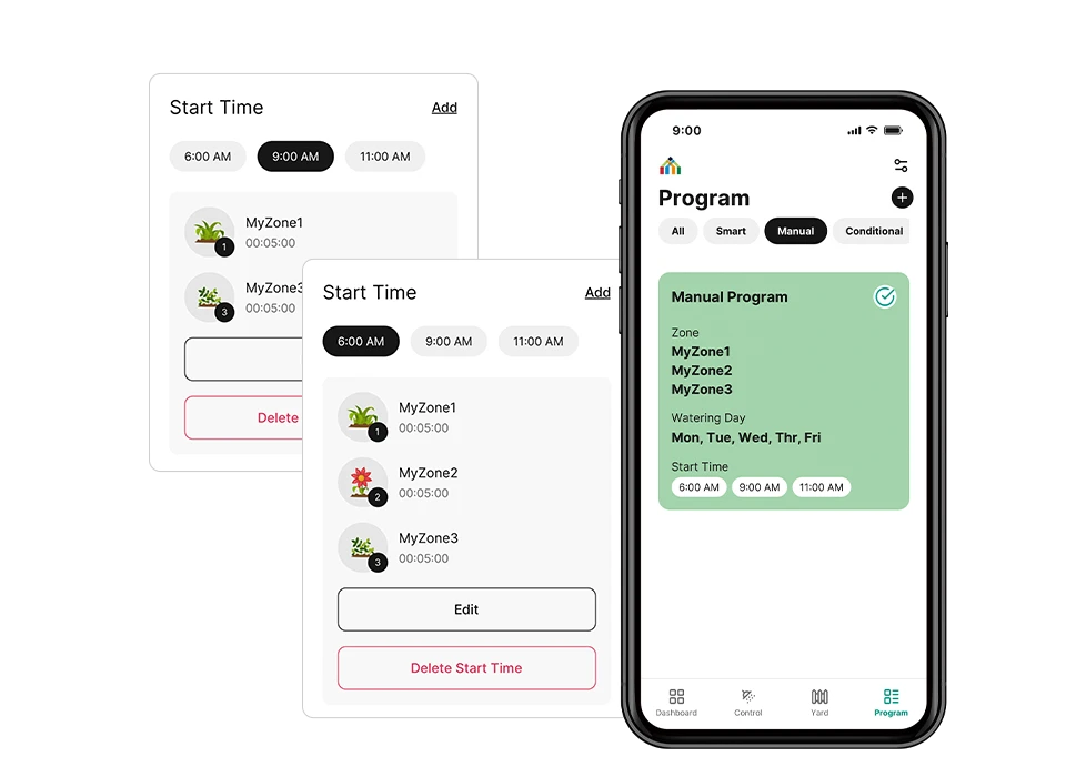 In the Main tab, you’ll be able to access your Yardian device settings and review the latest information regarding your watering schedule, zone settings, total water used, news, ect. Yardian receives and updates your 7-day watering schedules every day to guarantee uninterrupted service when it is temporarily offline.