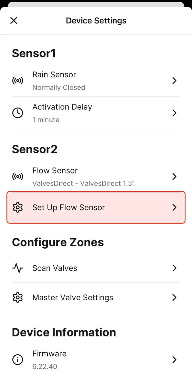 You can set up your sensor in “Yardian Device Settings” on the “Home” tab of your app. If you have a flow sensor configured, the flow rate in Gallon/Liter Per Minute will be shown on the “Home” tab. Your water usage will be calculated based on the measured flow rate.