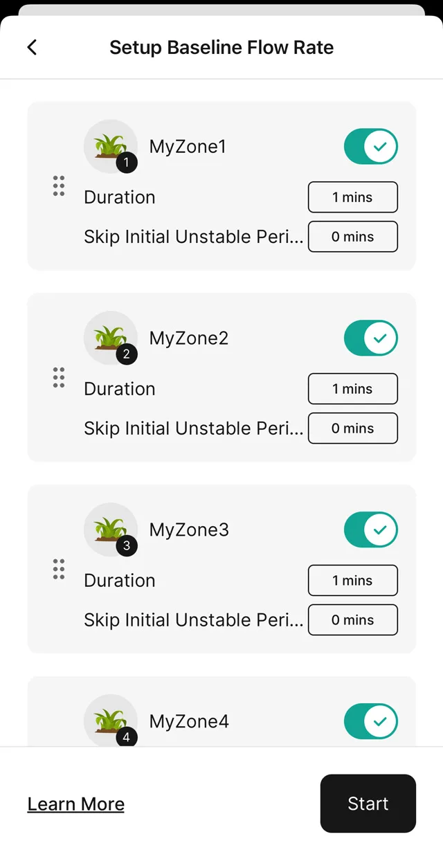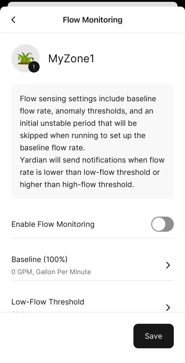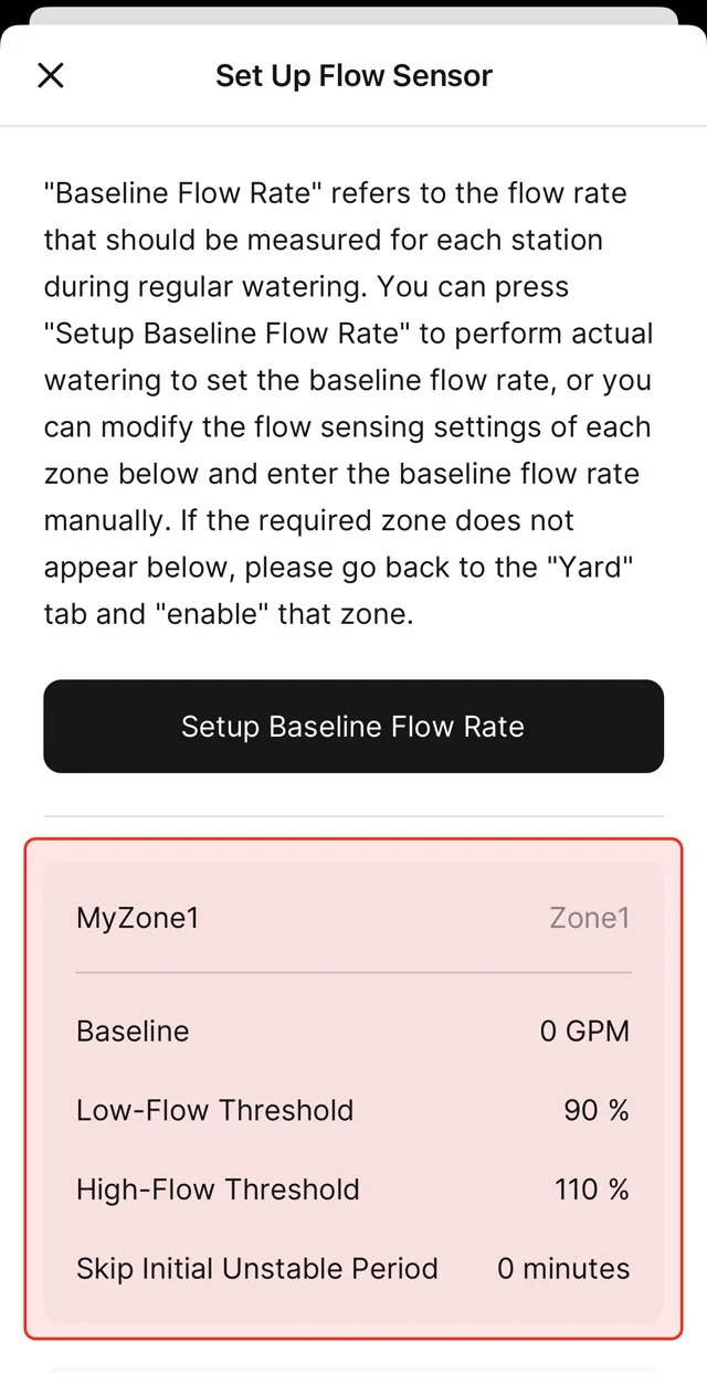 You will be asked to set up a base line flow rate for each zone. The Yardian app will guide you through the process. Once a baseline flow rate is set up, your Yardian will notify you when the measured flow rate is higher or lower than a threshold (in percentage) you specified.