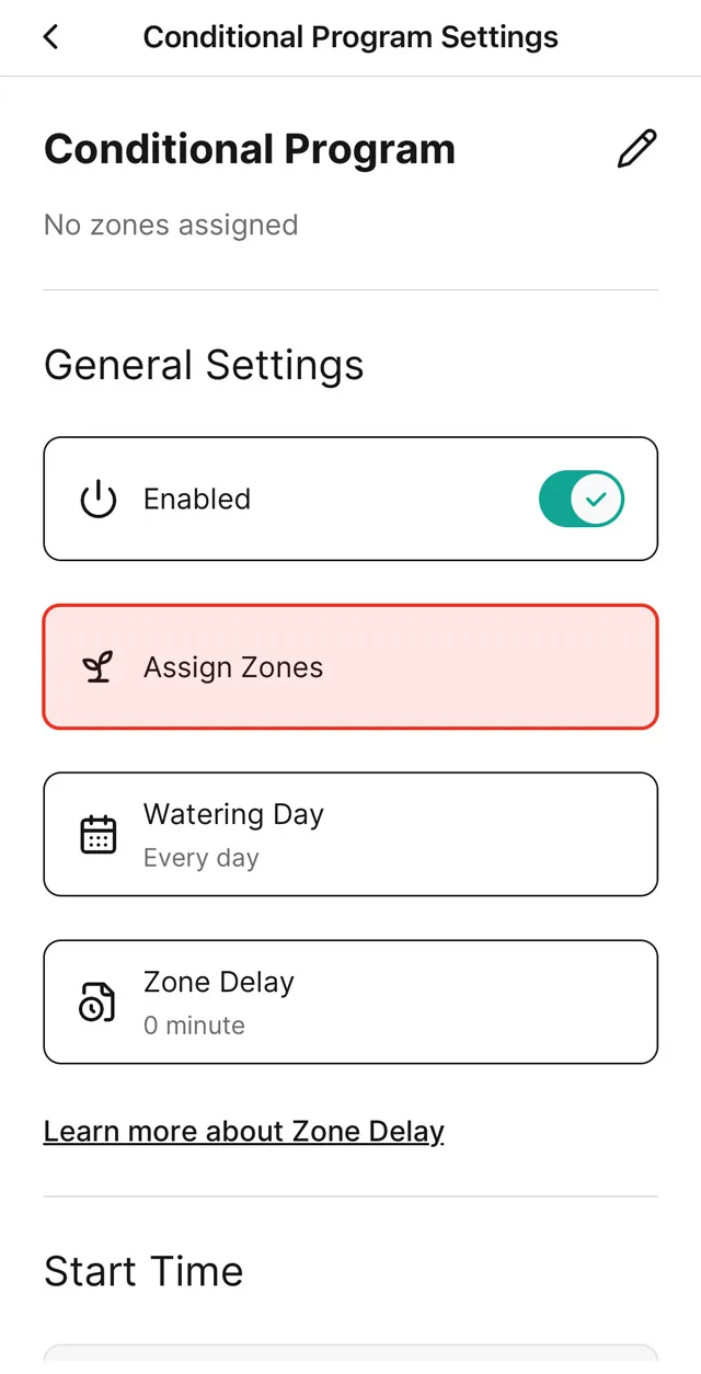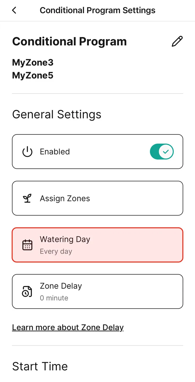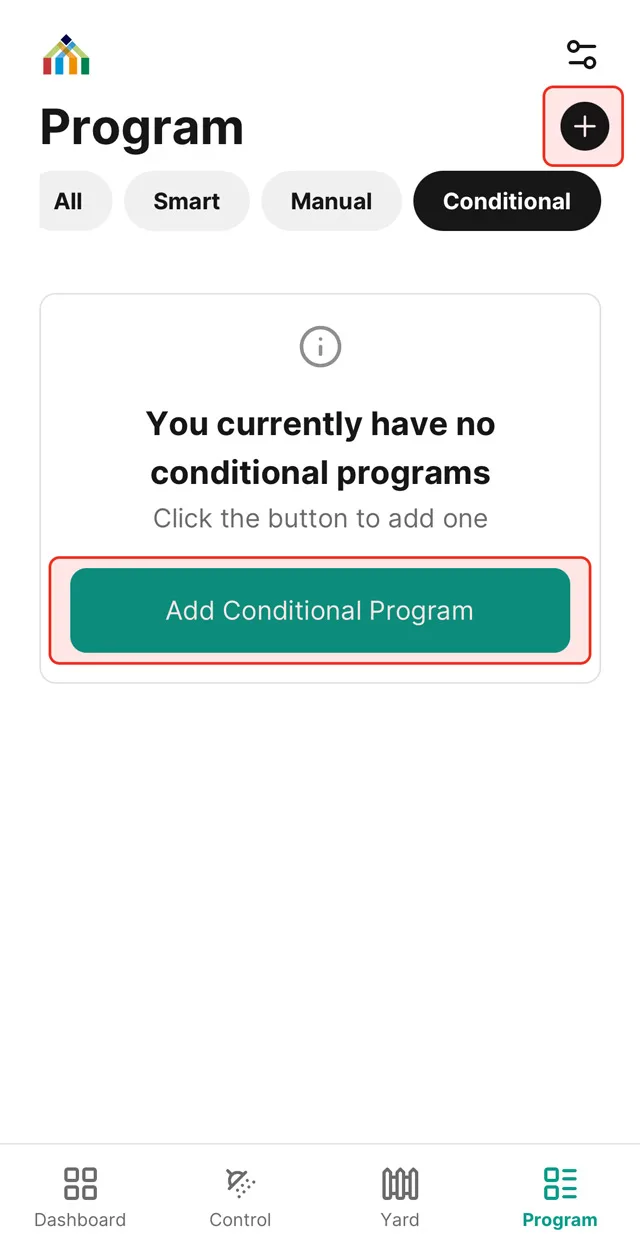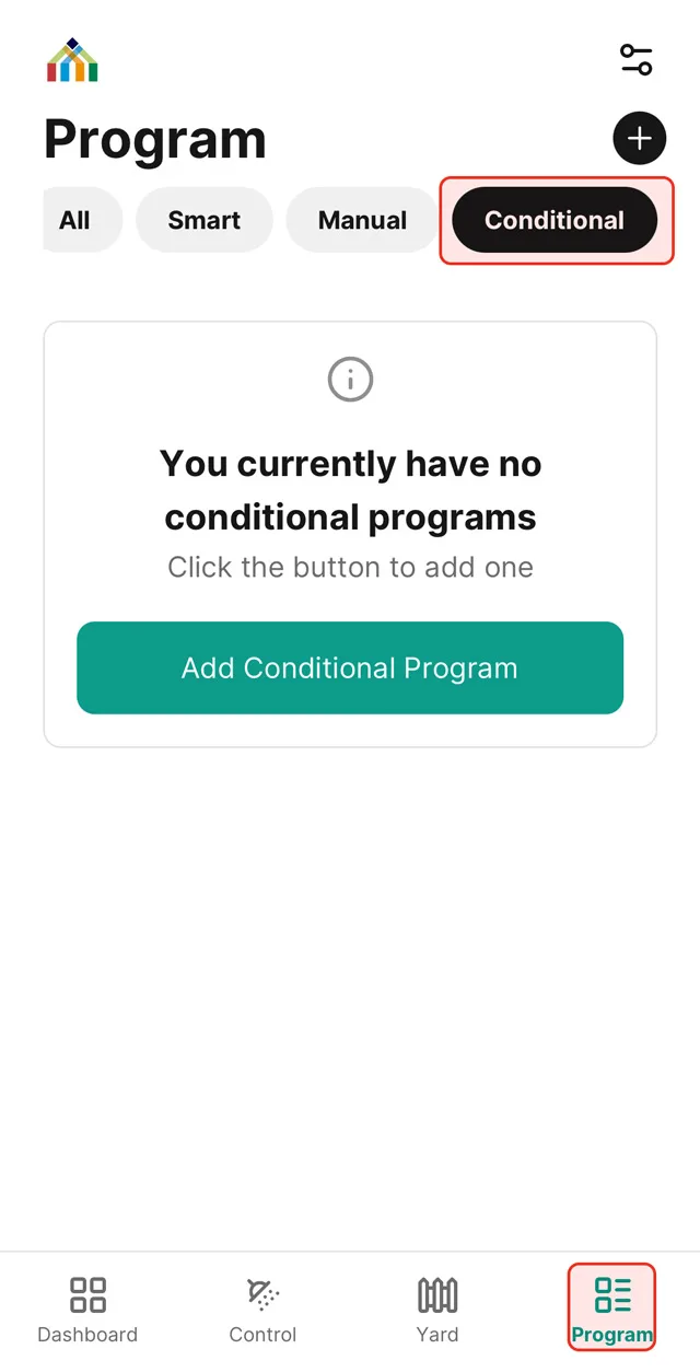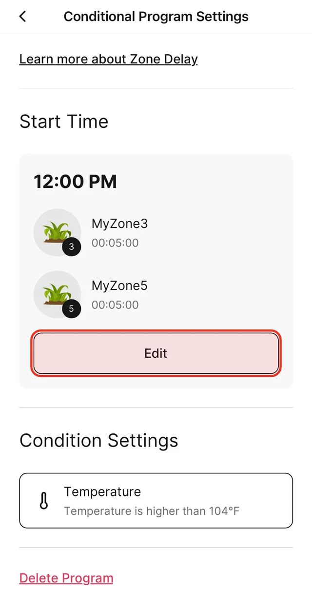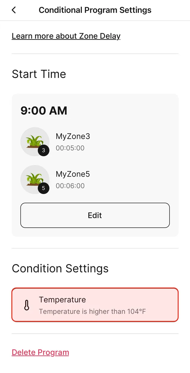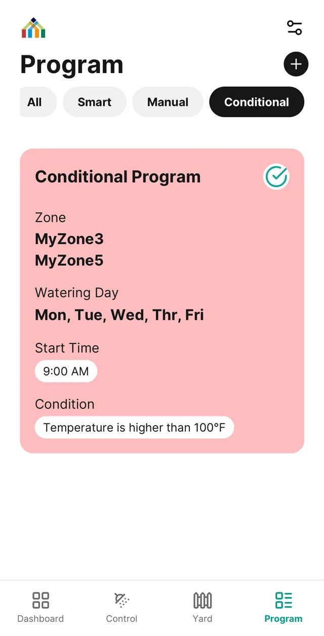 It’s a special program that you can use in addition to a Smart Program or Manual Program for your zone(s). A Conditional Program has a higher priority than a Smart Program or Manual Program if there’s a watering time conflict. For example, let’s say you have a Conditional Program set at 5pm every day for 3 minutes when the temperature is higher than 95°F, as well as a Manual Program set at 5pm every day with a duration of 10 minutes. Whenever the Conditional Program is executed, the watering task from the Manual Program will be modified to 5:03pm ~ 5:10pm.